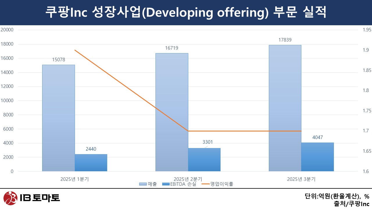 하지만 내실 개선이 여전히 숙제로 남는다. 쿠팡 모회사인 쿠팡Inc가 발표한 올 3분기 성장사업 부문(대만·파페치·쿠팡이츠) 매출은 1조7839억원(12억8700만달러)으로 전년 동기보다 31% 증가했지만, 조정 상각 전 영업이익(EBITDA) 손실은 4047억원으로 134.6% 확대됐다. 영업이익률 또한 지난해 4분기 3.9%를 정점으로 올해 1분기 1.9%, 2분기 1.7%, 3분기 역시 1.7%로 하락세를 이어갔다. 외형은 커졌지만 수익성은 오히려 후퇴한 셈이다.