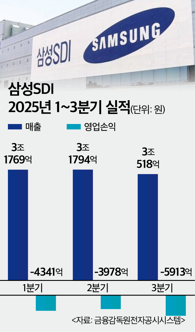 6일 금융감독원 전자공시시스템에 따르면 삼성SDI는 올해 3분기 연결기준 매출 3조518억원, 영업손실 5913억원을 기록했다. 매출은 전분기 대비 4.0%, 전년 동기 대비 22.5% 각각 감소했고 영업손익은 전년 동기(영업이익 1299억원) 대비 적자 전환했다. 이로써 올해 누적 영업손실은 1조4232억원으로, 3개 분기 만에 조 단위 적자에 진입했다.
