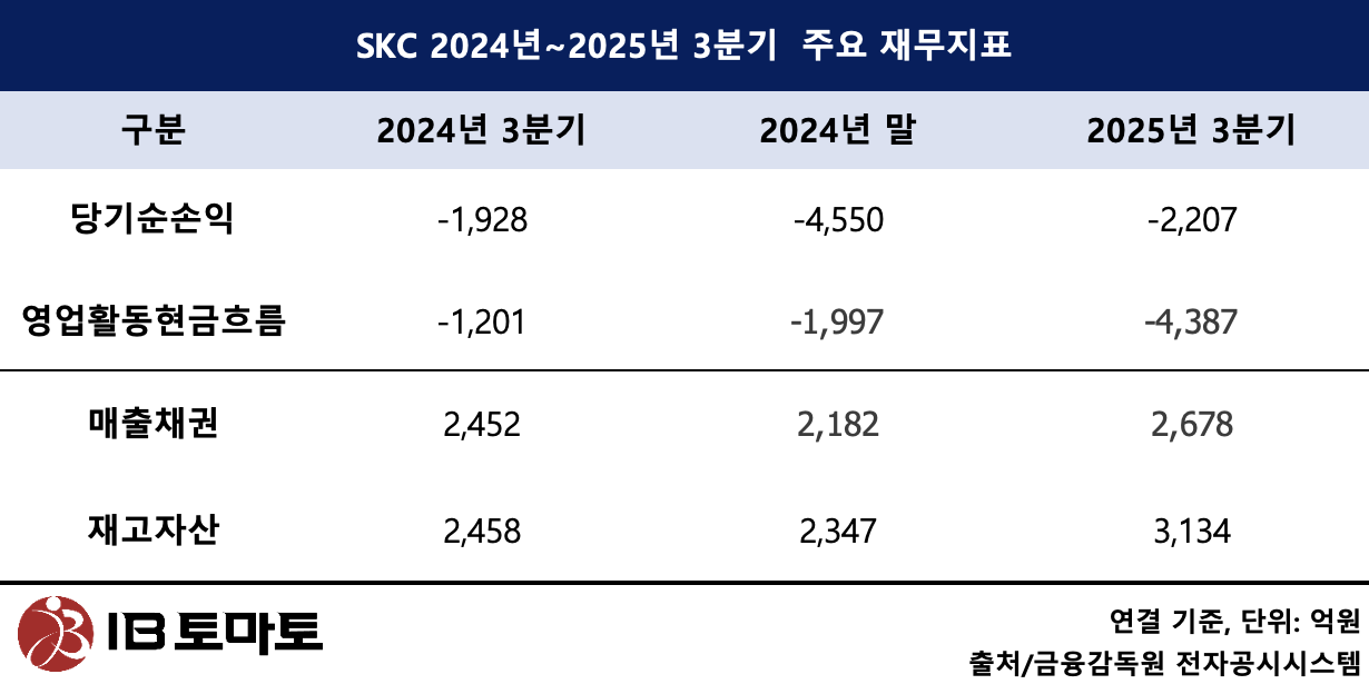 11일 금융감독원 전자공시시스템에 따르면 SKC의 올해 3분기 누적 영업활동현금흐름(OCF)은 –4387억원을 기록했다. 이는 전년 동기 –1201억원과 비교하면 현금유출 폭이 네 배 가까이 확대됐다. 같은 기간 분기순손실은 –2207억원으로 집계됐다. 손익 기준으로도 적자가 이어지고 있지만, 주목할 부분은 현금흐름 악화 속도가 손익 악화보다 훨씬 빠르게 나타나고 있다는 점이다.