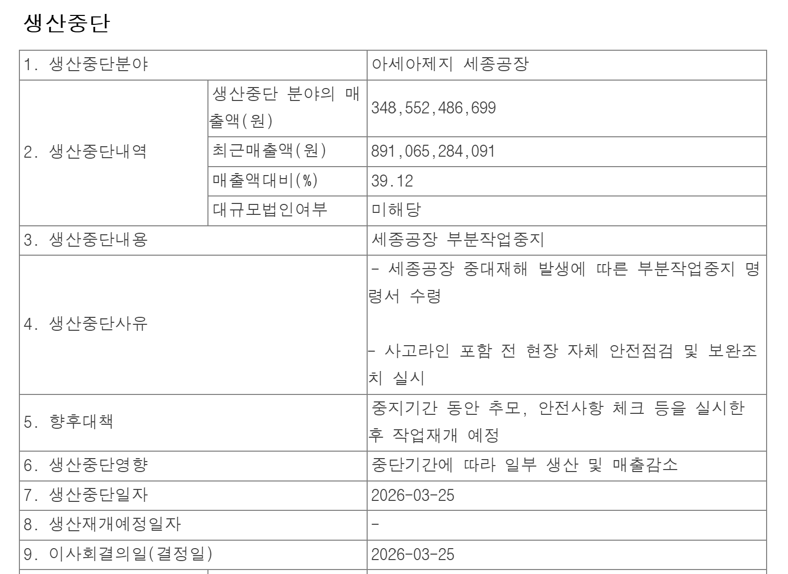 아세아제지 생산중단 공시. (사진=금융감독원 전자공시시스템)