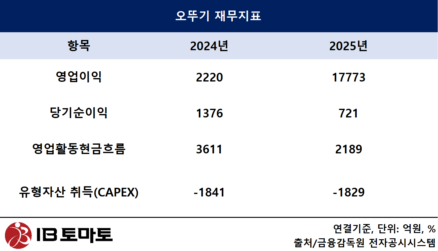 그럼에도 오뚜기는 재무·투자활동을 조정해 현금을 확보하는 모습이다. 공장 증설에 들어가는 대규모 설비 투자 등이 배경으로 작용해서다. 2024년 대비 지난해 회사의 재무활동현금흐름은 마이너스(-)1609억원에서 -343억원으로, 투자활동현금흐름은 -1982억원에서 -1006억원으로 현금유출 규모가 줄었다. 해당 항목들이 마이너스면, 회사가 차입·투자 활동을 활발히 하고 있다는 긍정적인 신호로 해석된다. 그러나 오뚜기처럼 해당 항목 적자 규모가 줄어들면, 보수적 경영에 들어간 것으로 파악할 수 있다.