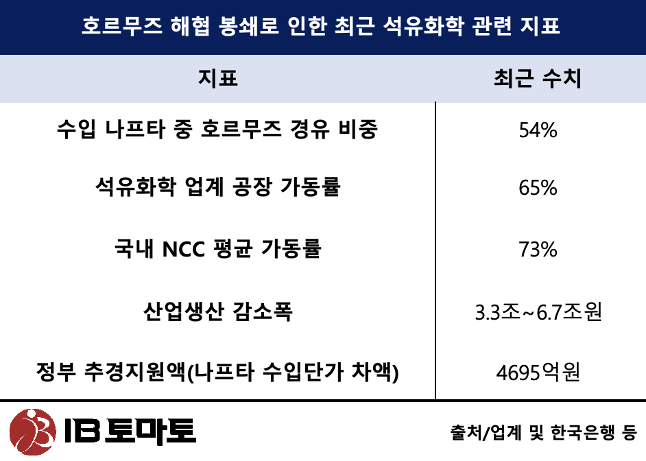 국내 대형 석유화학 기업의 한 관계자는 <IB토마토>와의 통화에서 "정부 지원책이 일부 효과가 있을지는 모르지만 근본적으로 중동지역 지정학적 리스크가 해소되지 않는 한 석유화학 산업의 수급 문제가 전반적인 후방산업으로 영향을 미치는 것은 어쩔 수 없는 부분"이라고 말했다.