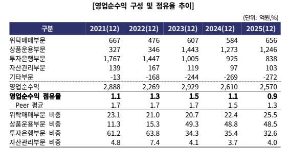 지난해 위탁매매부문 실적은 656억원으로 전체 영업순수익 중 25.5%에 그쳤다. 특히 이익규모가 축소되면서 이익 유보를 통한 자본 성장도 둔화됐다.