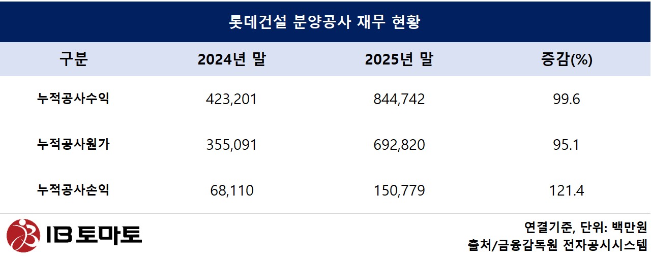 23일 금융감독원 전자공시시스템에 따르면 지난해 말 기준 롯데건설의 분양공사(자체사업) 재무 현황을 보니, 관련 누적 공사수익은 8447억원으로 전년(4232억원) 대비 약 99.6% 증가한 것으로 나타났다. 같은 기간 누적 공사원가는 6928억원으로 95.1% 늘었으며, 누적 공사손익은 1508억원으로 121.4% 증가해 수익 규모 역시 확대됐다.