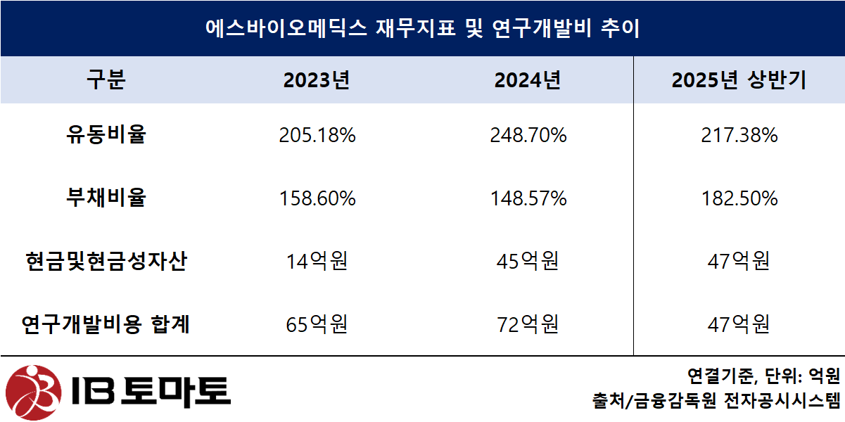현재 에스바이오메딕스는 줄기세포 치료제 후보물질 'TED-A9' 미국 후기임상을 추진중이어서 유동성 확보에 염두를 둬야하는 상황이다. 회사는 지난 8월15일(현지시간) 미국 식품의약국(FDA)에 TED-A9 후기임상을 위해 임상시험계획과 개발 전략 사전 논의하는 PreIND Type-B 미팅 신청했다고 밝혔으며, 국내에선 1/2a상 추적관찰 진행 중이다.