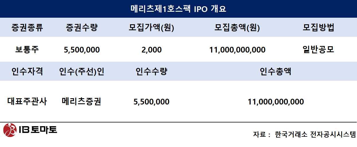 3일 한국거래소 전자공시시스템에 따르면 메리츠증권이 상장예비심사를 신청한 메리츠제1호스팩이 금융당국 심사를 통과했다. 메리츠제1호스팩은 지난 7월30일 예심을 신청했다가 10월2일 자진 철회된 바 있다. 이후 대주주 변경을 거쳐 지난 10일 재신청했다.