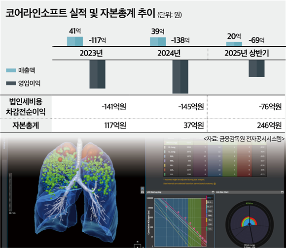 3일 금융감독원 전자공시시스템에 따르면 코어라인소프트의 반기말 기준 자본총계는 246억원으로 집계됐다. 이는 전기말 37억원 대비 564.86% 늘어난 수치로, 지난 6월 주주배정 유상증자를 통해 251억원을 조달했던 것이 주효했다.