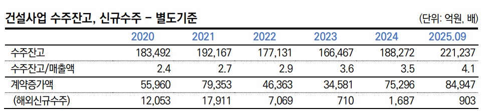 이는 기본도급액이 아닌 아직 매출로 인식되지 않은 공사 물량을 의미하는 계약잔액 기준이며, 전체 계약잔액 약 22조원 가운데 약 30% 수준에 해당한다. 건설업에서는 앞으로 수행할 공사 물량을 나타내는 지표가 계약잔액이기 때문에, 현재 일감 구조를 비교·분석할 때는 기본도급액이 아니라 계약잔액 기준을 사용하는 것이 일반적이라는 설명이다.