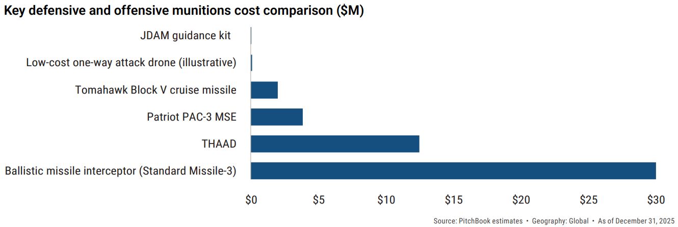 요격 미사일 한 발의 가격이 최대 수천만달러에 달하는 만큼 전쟁이 장기화될 경우 재고 보충을 위한 추가 국방 예산이 수십억달러 규모로 확대될 가능성이 있다는 것이 피치북 분석이다. 현대전에서 사용되는 무기들이 평시 생산라인으로는 수요를 감당하기 어려워졌고, 무기 소비 구조와 방산 생산 능력의 한계가 드러났다는 평가다.