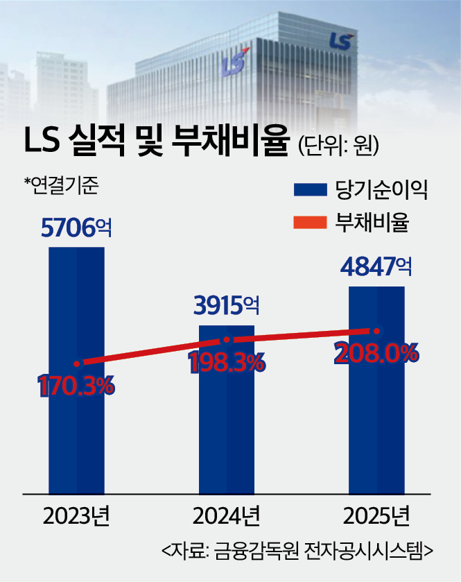 LS의 지난해 연결 기준 매출액은 31조 8250억원으로 전년대비 15.5% 증가하면서 역대 최고치를 기록했다. 순이익은 4847억원으로 23.8% 늘었다. 2000억원 규모 투자는 재무 규모 대비 감당 가능한 수준이지만 부채비율은 2023년 170.3%, 2024년 198.3%, 지난해 3분기 208%로 지속적으로 올라가는 추세다. 최근 이어지는 그룹 투자 확대 흐름을 고려하면 지주사의 현금 관리가 중요해질 수 있다는 분석이 나온다.