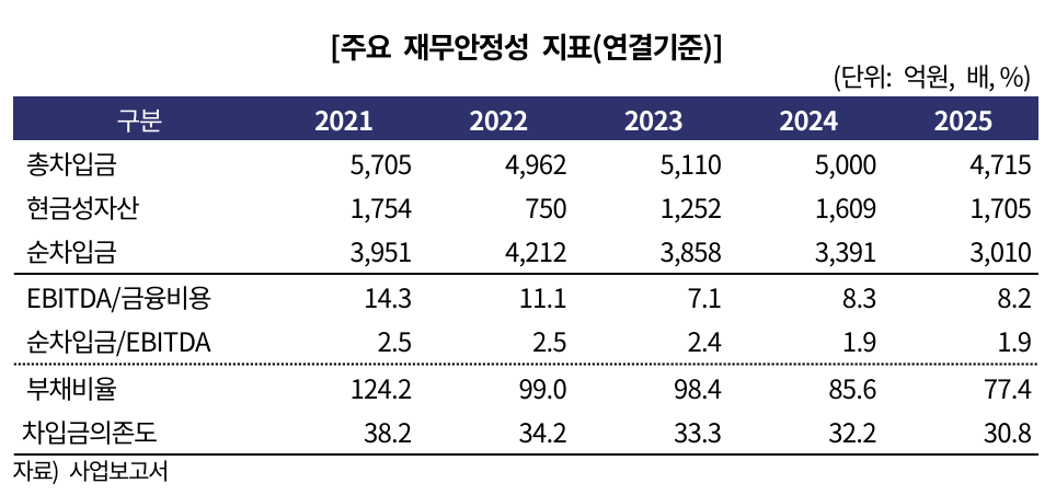 차입금 감소세가 나타나면서 재무레버리지 지표도 개선세를 보이고 있다. 연결기준 회사의 부채비율은 2024년 말 85.6%에서 2025년 말 77.4%로, 차입금의존도는 32.2%에서 30.8%로 개선됐다.