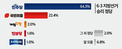 메뉴설정 ①국민 64.3% "6·3 지선, 민주당 승리"…56.3% "정권안정"(종합)... 박지원 25.6%조정식 7.2%김태년 3.8% [민주당 지지층 22대 후반기 국회의장 선호도]박지원 43.7%조정식 7.4%김태년 4.6% [6·3 지방선거 승리 정당]민주당 64.3%국민의힘 22.4%개혁신당 2.0%진보당 1.6%조국혁신당 1.0%그 외 정당 2.0%잘 모름 6.8% [6·3 지방선거, 정권안정 대 정권견제]정권안정 56.3%정권견제 34.3% [이재명 대통령 국정 운영 지지도]매우 잘하고 있다 47.3%(4.2%↓)대체로 잘하고 있다 14.1%(1.8%↓)대체로 못하고 있다 11.6%(... - ④6·3 지방선거, "정권안정" 56.3% 대 "정권견제" 34.3%... - 민주당은 '화기애애'…정청래 만난 김경수 "반드시 승리"... - ⑥민주 49.2% 대 국힘 30.2% 뉴스토마토 유튜브 라이브 채널 바로가기 → 오늘의 라이브 편성표 07:50 뉴스in사이다 16:50 끝장뉴스 17:50 끝내주는 경제 (정기여론조사)④6·3 지방선거, "정권안정" 56.3% 대 "정권견제" 34.3% 다가오는 6·3 지방선거와 관련해 국민 절반 이상이 "정부의 국정 안정을 위한 방향으로 투표에 임하겠다"며 이른바 '정권 안정론'에 동의하는 것으로 나타났습니다. "정부를 견제하기 위한 방향으로 투표에 임하겠다"는 '정권 견제론'에 대해선 30% 정도가 공감을 표시했습니다. 특히 이번 지방선거의 승부처로 꼽히는 서울에선 절반 이상이 '정권 안정론'에 힘을 실었습니다. (그래픽뉴스토마토) 23일 공표된 ... (정기여론조사)③국민 64.3% "6·3 지방선거, 민주당 승리"…10명 중 2명만 "국힘 승리"... 6·3 지방선거가 41일 남은 가운데 국민 60% 이상이 민주당의 승리를 점쳤습니다. 반면 국민의힘이 이길 것이라고 예상한 응답은 20%대 초반에 그쳤습니다. 대구·경북(TK)을 제외한 전 연령과 지역에서 민주당의 승리를 예상했습니다. (그래픽뉴스토마토) 23일 공표된 <미디어토마토> 187차 정기 여론조사 결과에 따르면, '이번 6·3 지방선거에서 어느 정당이 승리할 것으로 보는지' 묻는 질... SK하이닉스 1분기 영업익 37.6조…전년비 405% 상승, 사상 최대 SK하이닉스는 연결 기준 1분기 매출액이 52조5762억원, 영업이익은 37조6102억원으로 집계됐다고 23일 공시했습니다. 이는 전년 동기 대비 각각 198.1%, 405.5% 상승한 수치입니다. 경기 이천시 SK 하이닉스 본사 모습. (사진뉴시스) 같은 기간 당기순이익은 40조3459억원으로 집계됐습니다. 이명신 기자 sin@etomato.com... (정기여론조사)⑤이 대통령 지지율 61.4%…30대·PK 긍·부정 '팽팽' 이재명 대통령의 국정 운영 지지율이 하락하면서 60%대 초반으로 내려왔습니다. 30대와 부산·울산·경남(PK)을 제외한 전 연령과 지역에서 이 대통령의 국정 운영에 대한 긍정 평가 응답이 높았습니다. (그래픽뉴스토마토) 23일 공표된 <미디어토마토> 187차 정기 여론조사 결과에 따르면, 전체 응답자의 61.4%는 긍정 평가('매우 잘하고 있다' 47.3%, '대체로 잘하고 있다' 14.1%)를 내렸습니다. 부정 평... (정기여론조사)⑥민주 49.2% 대 국힘 30.2% 민주당 지지율이 하락하면서 40%대 후반으로 내려왔습니다. 반면 국민의힘 지지율은 상승하면서 다시 30%대를 회복했습니다. 양당의 지지율 격차가 좁혀졌지만, 여전히 민주당이 20%포인트가량 크게 앞서는 것으로 나타났습니다. (그래픽뉴스토마토) 23일 공표된 <미디어토마토> 187차 정기 여론조사 결과에 따르면, 정당 지지율은 민주당 49.2%, 국민의힘 30.2%, 개혁신당 2.9%, 조국혁신당 2.8%,... [인터뷰] 민형배, 수도권 일극체제 깰 전남·광주 3대 비전 제시 더불어민주당 전남광주통합특별시장 후보 민형배 의원이 22일 방송된 뉴스토마토 <이광재의 끝내주는 인터뷰>에서 “전남·광주가 수도권 일극 체제를 깨고, 대한민국 성장의 새로운 엔진이 되겠다”며 경제 대도약, 정치적 대전환, 사회문화적 대번영 등 3대 비전을 공개했습니다. 민 의원은 △경제 대도약: 풍부한 재생에너지를 기반으로 첨단산업을 유치하고 △정치적 대전환: 시민이 설계하... 뉴스리듬 K배터리, 벤츠 공급망 잇단 진입…‘프리미엄 전략’ 주효 팔란티어서 스킬드AI, 엔비디아까지…LG, ‘AX 기술 동맹’ 구축 이용우 "CU 물류센터 참변, 책임 명명백백히 밝혀야"  "이광재 하남-송영길 연수-하정우 북갑" 민주당이 6·3 지방선거와 함께 치러지는 국회의원 재·보궐선거에 출마할 후보군을 사실상 내정했습니다. 당 공천 진행 상황을 잘 알고 있는 고위 관계자는 22일 <뉴스토마토>...  '큰 꿈' 꾸는 박찬대…"인천도 중앙무대서 돋보일 수 있다" 6·3 지방선거 인천시장에 도전하는 박찬대 민주당 의원이 지난 21일 경남 김해 봉하를 찾아 노무현 전 대통령 묘소를 참배했습니다. 박 의원은 "노 전 대통령 기일이 5월23일인데, 지방선거 운... TSMC도 제친 SK하이닉스…영업이익률 ‘72%’ SK하이닉스가 인공지능(AI) 메모리 수요에 힘입어 올해 1분기 매출과 영업이익 모두 최대 실적을 기록했습니다. 계절적인 비수기에도 불구하고 고대역폭메모리(HBM), 서버용 D램, 기업용 SSD(eS... 공급망 쇼크에 기후 역습까지…"시간이 없다" 중동발 지정학적 리스크의 노이즈가 여전히 계속되고 있는 가운데 급변하는 국제 정세만큼, 살아남기 위한 국가 간의 전략적 공조도 요구되고 있습니다. 단순한 외교적 관계의 개선을 넘